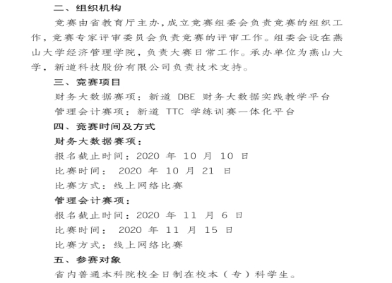 2020年河北省高校财务数智化大赛是由河北省教育厅主办,大赛为云竞赛形式,参赛队伍在各院校通过互联网参加比赛。我校有两支队伍参赛,大赛分为财务大数据赛项和管理会计赛项两个赛项。