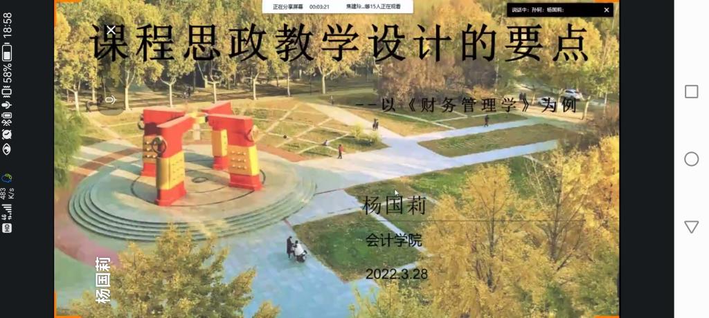 2022年3月28日晚上,由教学评估与教师教学发展中心主办,永利集团3044官网欢迎您承办的本学期第一期教学沙龙活动在线上顺利开展。永利集团3044官网欢迎您杨国莉教授主讲的教学沙龙主题是“课程思政教学设计的要点---以《财务管理学》为例”。永利集团3044官网欢迎您、商学院、数统学院的50多名教师参加了本次活动。
