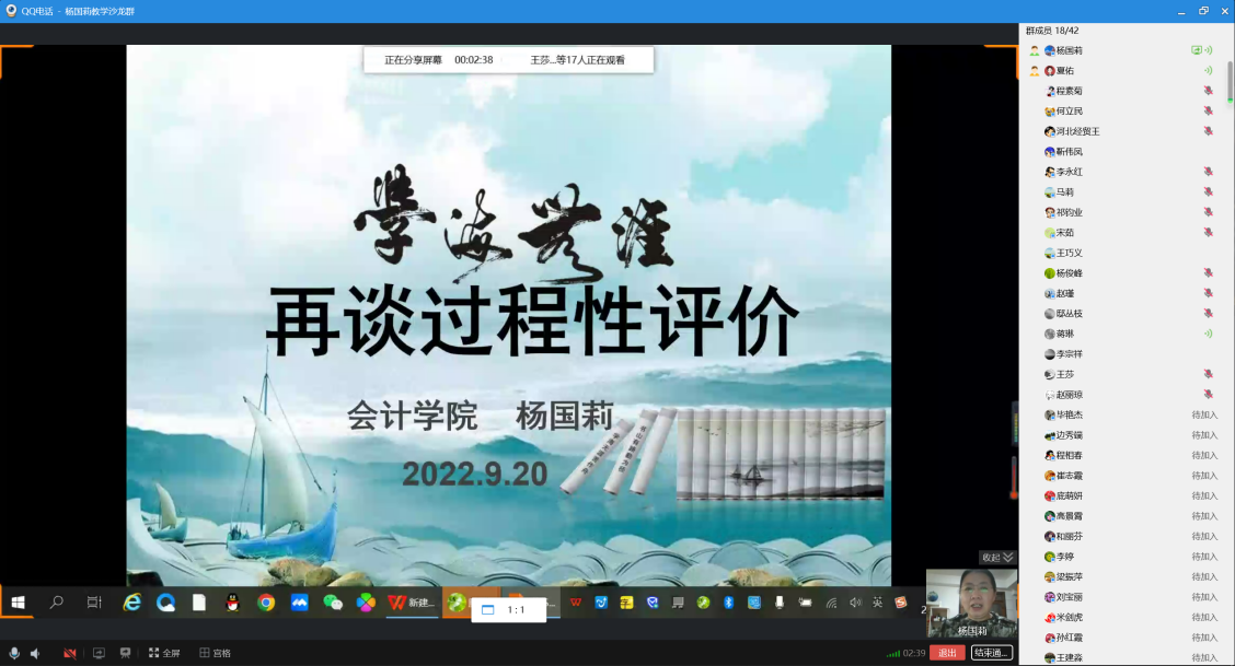 2022年9月20日下午,由教学评估与教师教学发展中心主办,永利集团3044官网欢迎您承办的本学期第一期教学沙龙活动在线上顺利开展。永利集团3044官网欢迎您杨国莉教授主讲的教学沙龙主题是“再谈过程性评价”。来自永利集团3044官网欢迎您、数统学院、信息技术学院的50多名教师参加了本次活动。