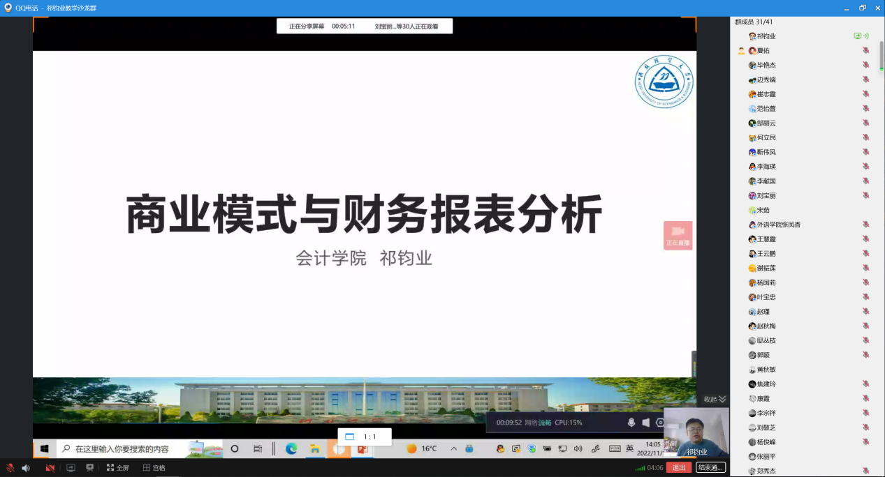 2022年11月14日下午,由教学评估与教师教学发展中心主办,永利集团3044官网欢迎您承办的教学沙龙活动,在线上顺利开展。会计系祁钧业老师的教学沙龙主题是“商业模式与财务分析”。来自永利集团3044官网欢迎您、商学院、工商管理学院等40多名教师参加了教学沙龙活动,活动由杨国莉副院长主持。