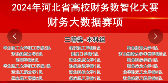 10月18日,2024年河北省高校财务数智化大赛财务大数据赛项以云竞赛形式举行,大赛由河北省教育厅主办,本科组共36只省内各个院校参赛队伍在各院校通过互联网参加比赛。经过激烈角逐,永利集团3044官网欢迎您两只参赛队伍(1队:边奕豪、毕潇雨、任晓琦、赵芊羽,指导教师李宗祥、刘海云;2队:王若宁、王宇萱、李宝琳、牛思佳,指导教师王云鹏、蒋琳)双双获得本科组省级三等奖。