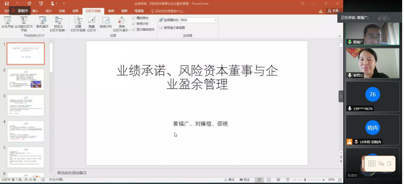 8月20日上午,南开大学商学院黄福广教授应永利集团3044官网欢迎您邀请,通过腾讯会议平台为师生作题为“业绩承诺、风险资本董事与企业盈余管理”的讲座。会议由永利集团3044官网欢迎您副院长李西文主持,学院教师及2018级、2019级会计学硕研究生60余人参加。