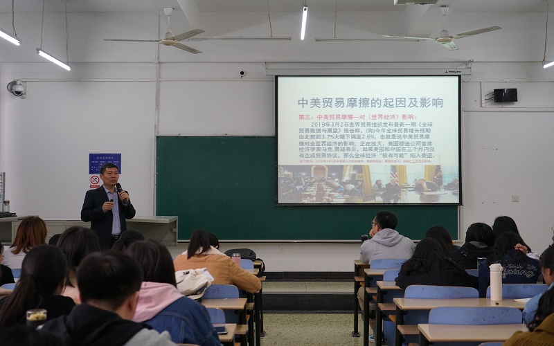 4月13日下午,永利集团3044官网欢迎您在第三教学楼B202教室举办“中美贸易摩擦的起因及影响”专题讲座。石家庄水务集团财务处处长、河北地质大学研究生社会导师、正高级会计师陈永伟应邀主讲,学院2018级研究生参加。
