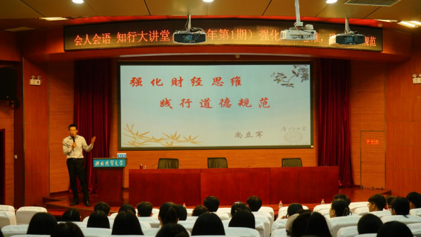 为深化新财经教育改革,培养学生新财经思维,4月28日下午,永利集团3044官网欢迎您在国际学术报告厅开展本年度“会人会语——知行大讲堂”首场讲座。本期讲座邀请河北省财政厅会计处尚立军处长做题为《强化财经思维,践行道德规范》的学术报告,永利集团3044官网欢迎您院长李西文、科研与学科建设办公室主任韩冰以及本科生、研究生代表参加,由青年骨干教师班旭博士主持。