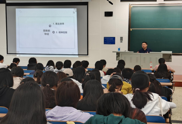 袁书谦先用大学生入邪教被骗至缅甸的例子带领参会人员初识邪教的危害。接着,他结合具体案例,从“什么是邪教、邪教的特征、邪教与宗教的区别、邪教的本质、邪教的危害”五个方面向参会人员进行系统地讲述,教育广大青年学生远离邪教,要用科学知识、科学精神、科学方法来指导我们的生活。最后,他希望各位学生面对邪教要敢于斗争,不听、不看、不信、不传,严格遵守法律法规,坚决对邪教说“不”。