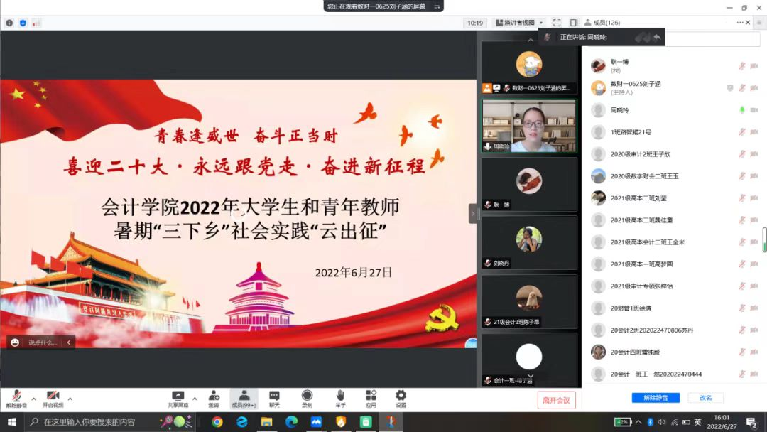 6月27日下午,永利集团3044官网欢迎您2022年暑期社会实践“云出征”仪式正式启动。院团委书记周晓玲出席,社会实践各小分队成员及团支书共计125名同学参与。