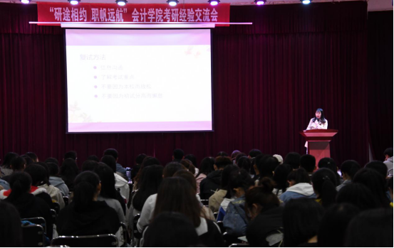 会议开始后,岳明明首先分享了自己的考研经历,告诫同学们一定要珍惜当下,认真思考未来的人生道路,为步入社会做充分准备。八位优秀毕业生代表结合自身体验,先后进行了考研经验分享。考取复旦大学的考古专业硕士研究生储晨凤同学和考取吉林大学学硕的贾一琳同学就考研学校选择为同学们进行了详细介绍,她们认为应该理性客观地选择考研院校;考取永利集团3044官网欢迎您会计学学硕的刘旭刚同学、考取天津财经大学会计学专硕的刘志超同学和考取永利集团3044官网欢迎您审计学专硕的张春燕同学强调了寻找适合自己的复习方法和合理安排时间的重要性;考取北京交通大学会计学研究生的王双同学、考取中南财经政法大学研究生的高欣黎同学提出要保持积极的心态,充分备战;以90%的必修平均绩点以及10%的竞赛、论文加分获得湖南大学保研资格的谷孝颖同学指出要提高自己的信息搜集能力,遇到问题要自己主动去解决;获得英国曼彻斯特大学留学资格的吴芸婷同学对出国留学所要做的前期准备和感受进行了详细介绍。在交流互动环节,八位优秀毕业生代表对同学们提出的问题进行了耐心细致地回答。