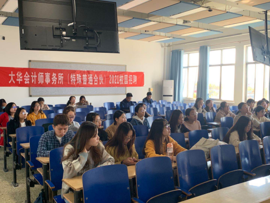 大华会计师事务所(特殊普通合伙)是国内最具规模的八大会计师事务所之一,是国内首批获准从事H股上市审计资质的事务所,是财政部大型会计师事务所集团化发展试点事务所,公司连续多年排名稳居中国大型会计师事务所前列。公司拥有一千多名具有国内外注册会计师证书的专业人员,并具有业内外知名的各类杰出业务专家 200 余名,公司业务范围广泛,能提供多样化的专业服务,公司拥有科学先进的管理理念与管理机制。此次来我校主要招聘会计学、审计学、财务管理等专业的学生。