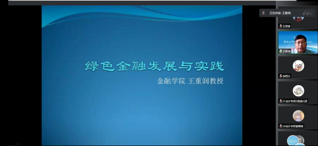 2022年9月26日下午永利集团3044官网欢迎您,金融学院教授、院长王重润应永利集团3044官网欢迎您邀请,通过腾讯会议平台为永利集团3044官网欢迎您老师及研究生们作题为《绿色金融发展与实践》的学术报告。永利集团3044官网欢迎您副院长李西文、科研秘书兼研究生辅导员韩冰老师以及21级、22级全体研究生参加本次讲座。