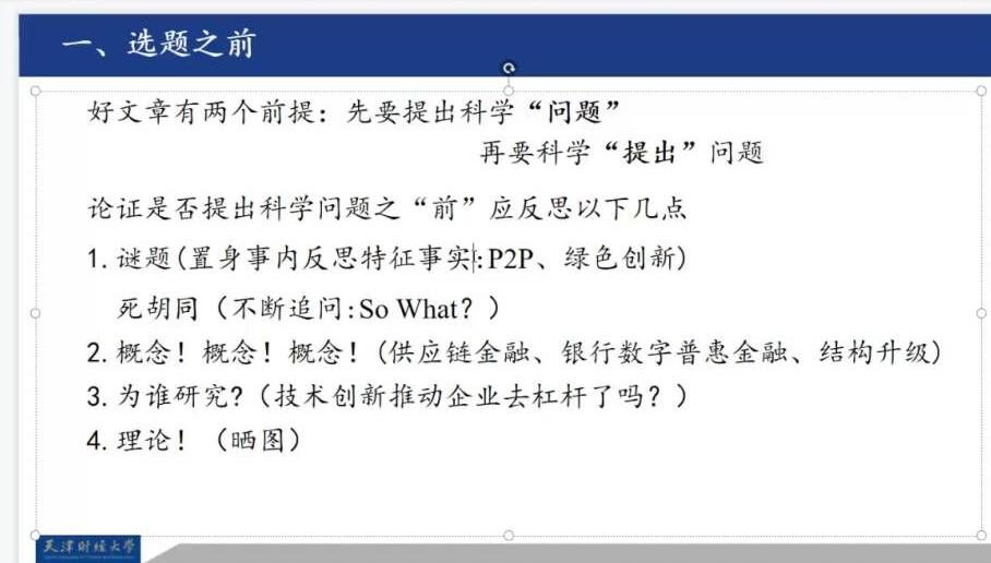 首先,于博副教授用自身写作过程中的遇到的陷阱而总结出来的经验为我们详细说明了选题的注意事项。于博副教授以制造业服务化为例给我们引入了在选题过程中可能遇到的陷阱和问题,以及我们在选题过程中应该注意的事项。