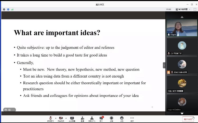2020年10月13日上午,中山大学国际金融学院孙凌霞博士应永利集团3044官网欢迎您邀请,通过腾讯会议平台为同学们作题为《如何撰写和发表高水平论文》的报告。永利集团3044官网欢迎您副院长李西文、学院部分教师及2019级、2020级全体研究生参加了本次讲座。